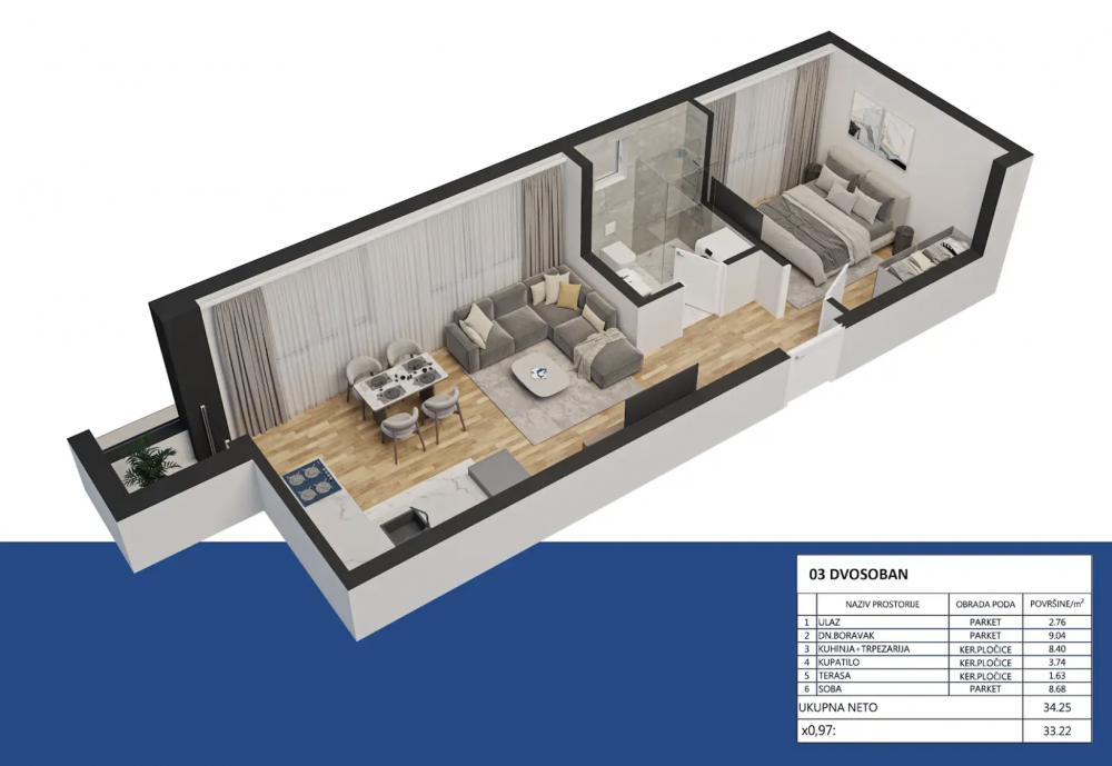 Telep, 33.22m2, dvosoban stan, novogradnja