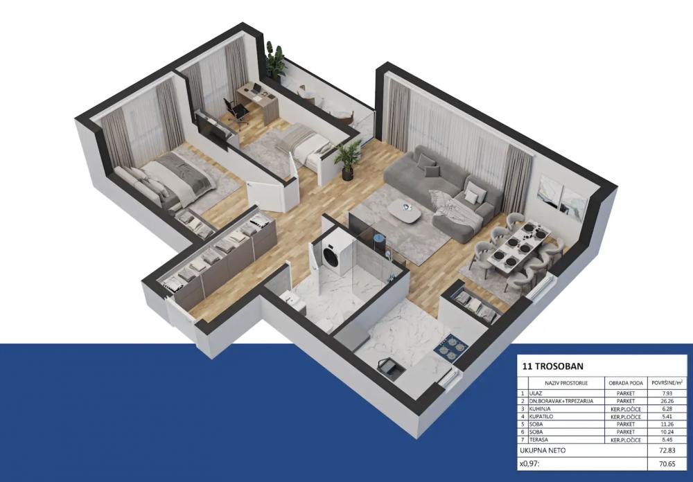 Telep, 70.65m2, trosoban stan, novogradnja