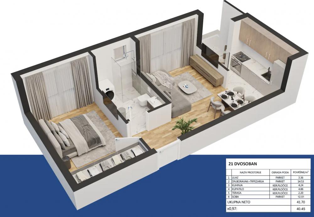 Telep, 40.45m2, dvosoban stan, novogradnja